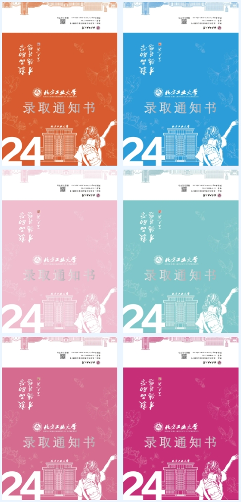 录取通知书底色与校标同色,为“工大紫”。同时学校还送出了彩蛋:少量印制了另外6种彩虹马卡龙青春色系(玫瑰红、宝石蓝、鲜果橙、胭脂粉、薄荷绿、珊瑚粉)的录取通知书随机发送。