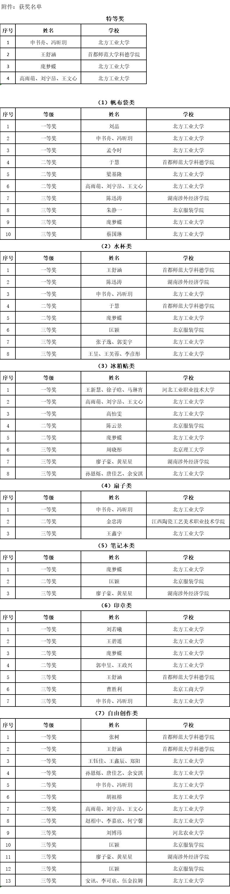 大赛设立了帆布袋、水杯、冰箱贴、扇子、笔记本、印章及自由创作类等七个类别赛道,经过激烈角逐,评选出一等奖17项、二等奖15项、三等奖20项。并根据大赛评审规则,综合评出特等奖7人。