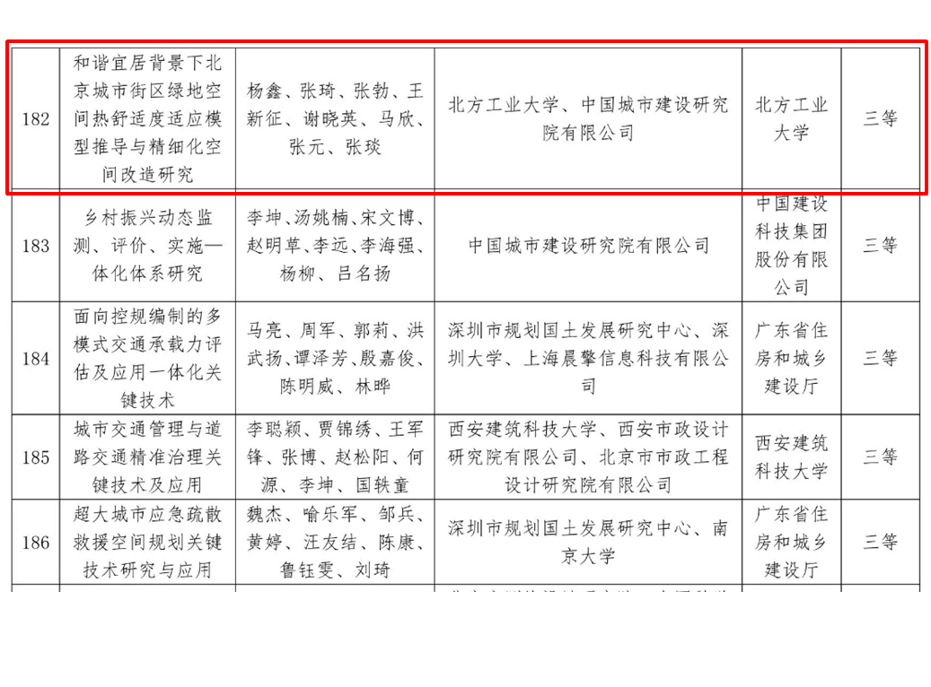 近日,住房和城乡建设部公布了2024年度华夏建设科学技术奖授奖项目名单。由我校87978797威尼斯老品牌建筑系杨鑫教授牵头,张勃、王新征、马欣等作为主要完成人申报的《和谐宜居背景下北京城市街区绿地空间热舒适度适应模型推导与精细化空间改造研究》获得三等奖,标志着87978797威尼斯老品牌取得了受到业界认可的重大科研成果。