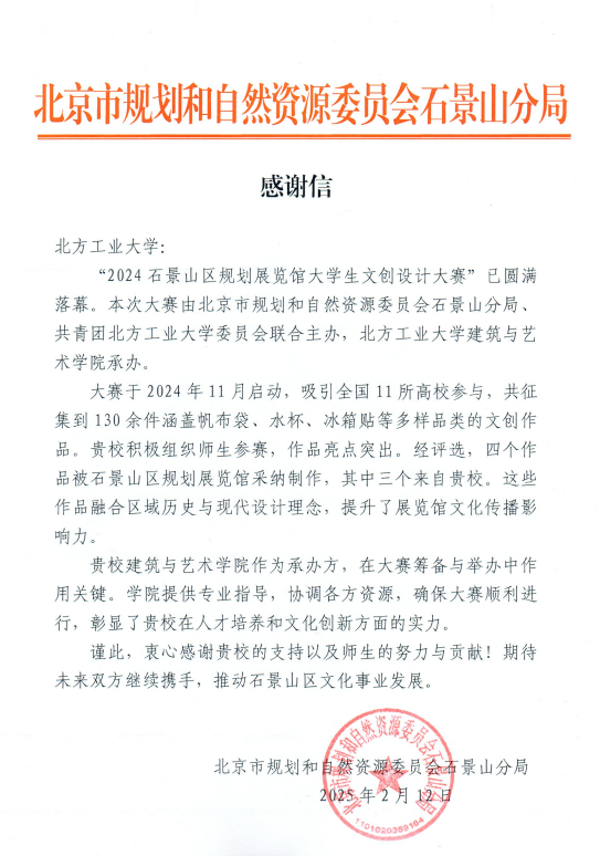 近日,我校收到北京市规划和自然资源委员会石景山分局发来的感谢信,感谢我校在筹备与举办“2024年石景山区规划展览馆大学生文创设计大赛”中发挥的关键作用。
