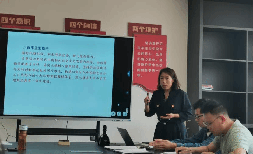宣传委员庞璐围绕“教什么”“怎么教”“谁来教”分享了自己对思政课建设的指导思想、使命任务、内容体系、目标要求等的理解,并表示作为一名思政课教师要把争做大先生,教好大学问,更好地担当起学生健康成长的指导着和引路人的责任,真正践行为党育人、为国育才的责任和使命。