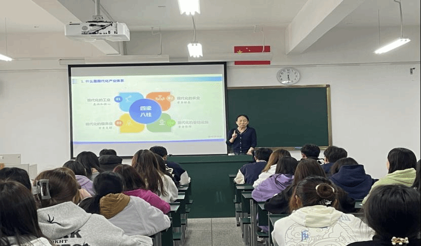 党委副书记、校长陈颖以“你对产业的了解有哪些?”为导入,从现代化产业体系的深刻意蕴、产业体系建设的现状与挑战、现代化产业体系建设的着力点等方面,结合学生专业实际、职业教育与产业关系、云南的“产业强省”战略等,采用大量实例,为学生讲解了“大力推进现代化产业体系建设”专题。