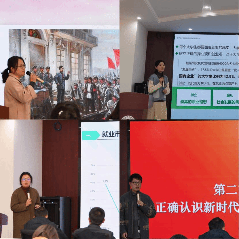 庞伟伟、庞璐、谭姝、蒋云朋四位老师分别代表毛泽东思想与中国特色社会主义理论体系概论课教研室、思想道德与法治课教研室、形势与政策课教研室、习近平新时代中国特色社会主义思想概论课教研室,根据各自所授课程的教材和教学要点,选定授课专题依次进行教学展示。每一位老师都把此次展示作为专业素养提升的契机,赛前认真备课、精心磨课,在二十分钟的展示环节中,以饱满的热情、扎实的功底展示了思政课教师良好的精神风貌。