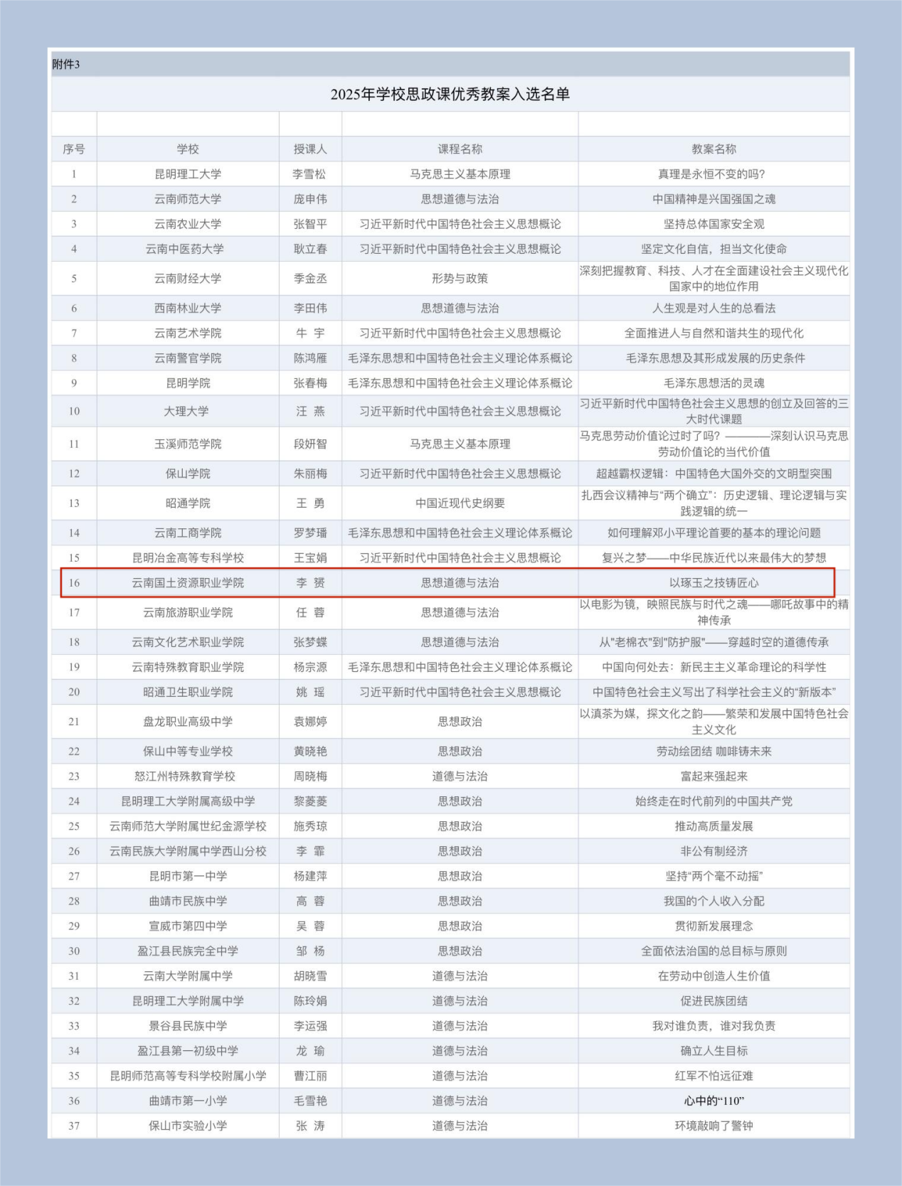 由云南省委教育工委组织开展的云南省学校思政课名师工作室、精品课程、优秀教案遴选工作圆满落幕。bv伟德官网bv伟德源自英国始于1946思政课教师李赟老师教案《以琢玉之技铸匠心》入选2025年云南省学校思政课优秀教案。