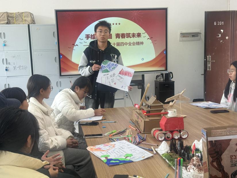 随后,各专业学院学生代表结合自身专业开展“学生手绘未来”实践活动,描绘“十五五”时期学习与生活的愿景。作品中“美丽中国建设”“乘坐飞船翱翔太空”“AI家园”“我们的智能生活”等主题不仅体现了对专业前沿的思考,更融入了“以人民为中心”“科技自立自强”“创新活力”等全会精神的核心内涵。